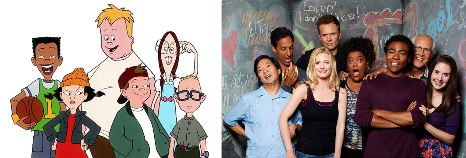 Both shows featured a tight-knit group of friends and a cast of quirky background characters who all have instantly-identifiable character traits (Swinger Girl, Star-Burns, King Bob, Magnitude, etc.). Most Community main characters have Recess counterparts: