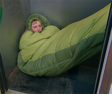 Super Hans pulls the drawstring on Jerry’s sleeping bag taut, trapping him inside, then drags him into the hall, where Jez “waterboards” him by pouring beer on his face through the tiny opening left by the drawstring.
