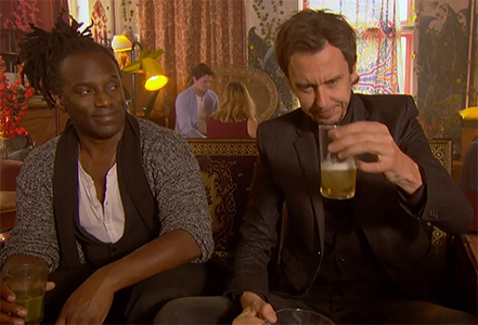 Super Hans drones on and on about the benefits of juice while ordering round after round of juice for the table, making the guys a bit sick. When the waitress accidentally brings them a tray of lagers, Mark and Jez convince Super Hans to have one beer “just to wet the whistle.” He does, and the next scene has him in the bathroom, belting out, “I just want to fuck and suck” to the tune of “Mary Had a Little Lamb” and shouting, “I love cocaine!”