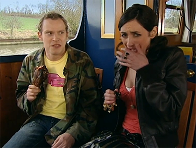 In season 4, episode 5, “Holiday” (2007), Jez rents a boat on the canal for Mark’s stag weekend. Things aren’t going so great until they meet two sisters, Aurora (Cara Horgan) and Lucy (Katy Brand), who are boating with their dad, Malcolm (Tom Knight).
